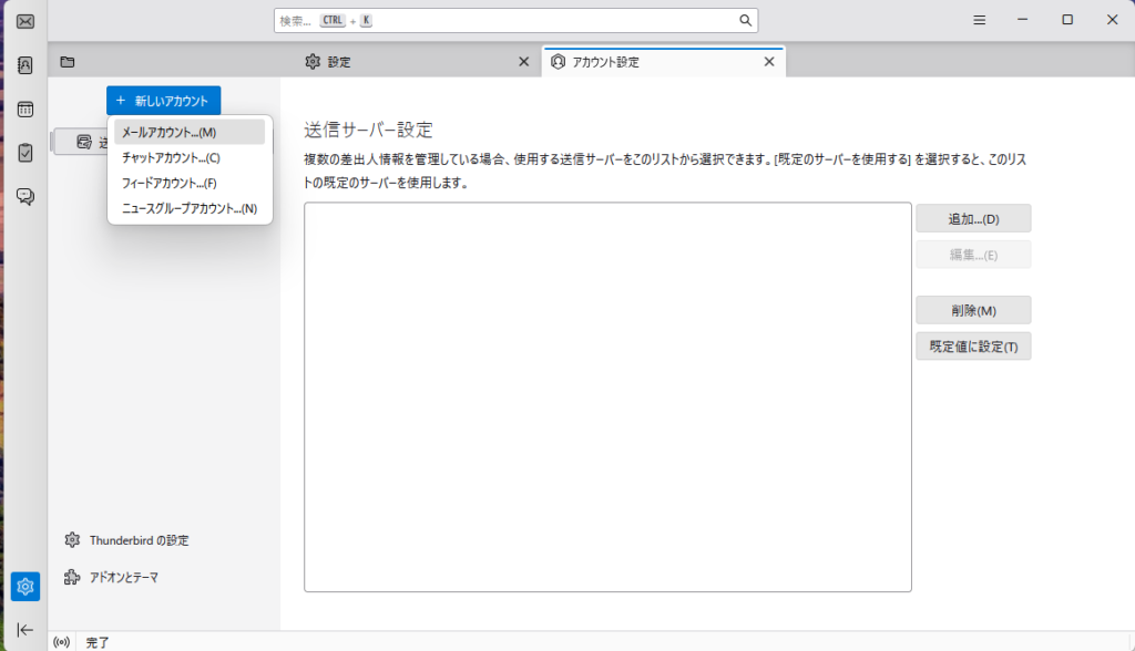 左の設定アイコンをクリックし、左側メニューの「新しいアカウント」→「メールアカウント」を選択します。