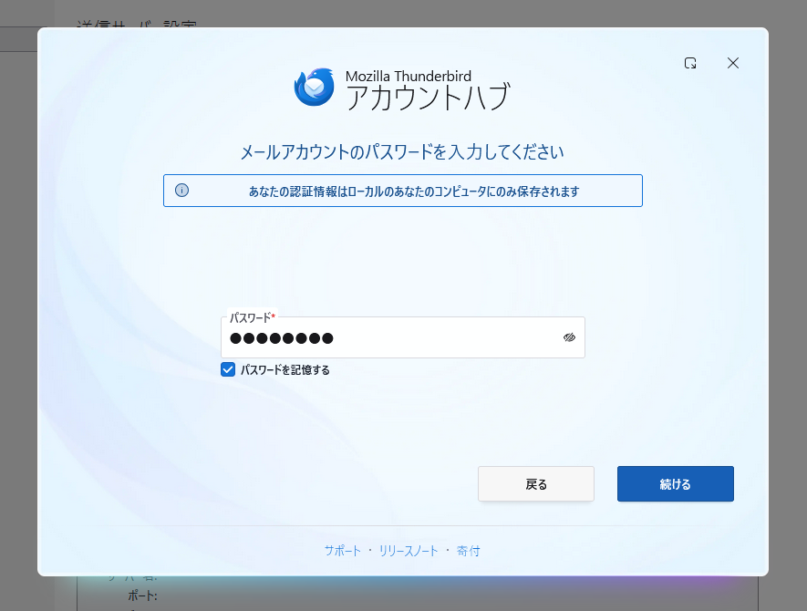 「メールアカウントのパスワードを入力してください」画面が表示されます。