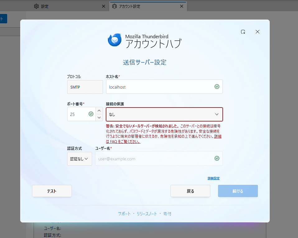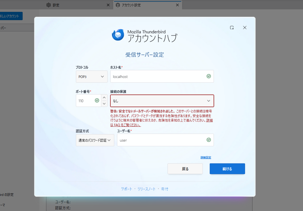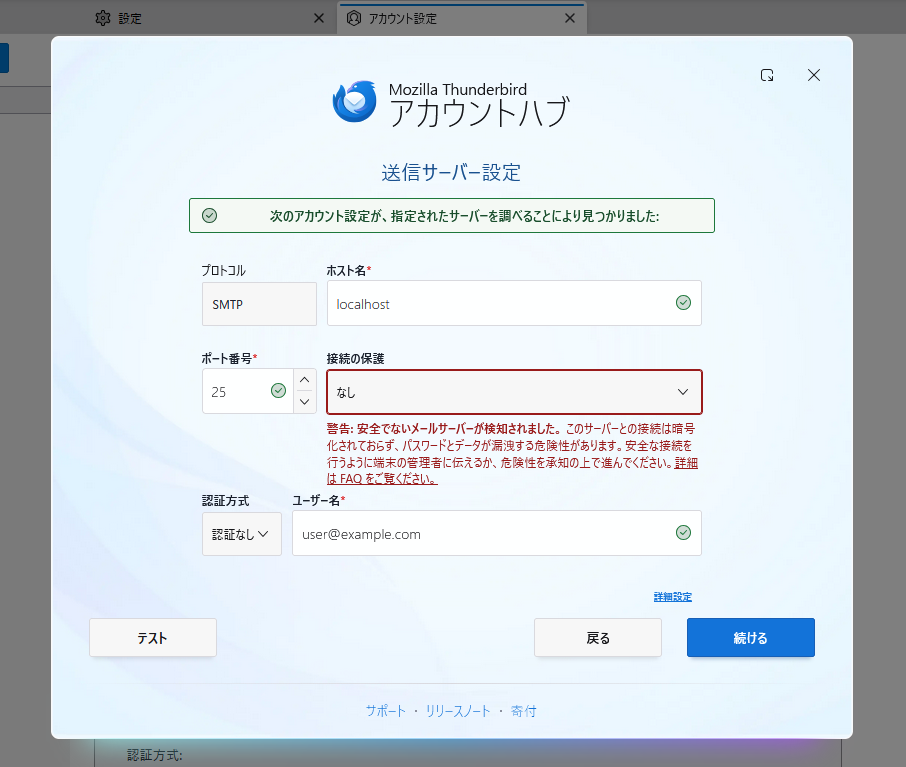 「接続の保護」を「なし」に設定すると、セキュリティ警告が表示されます。ローカル環境でのテスト用途であれば問題ありませんが、本番環境では別の接続を検討してください。