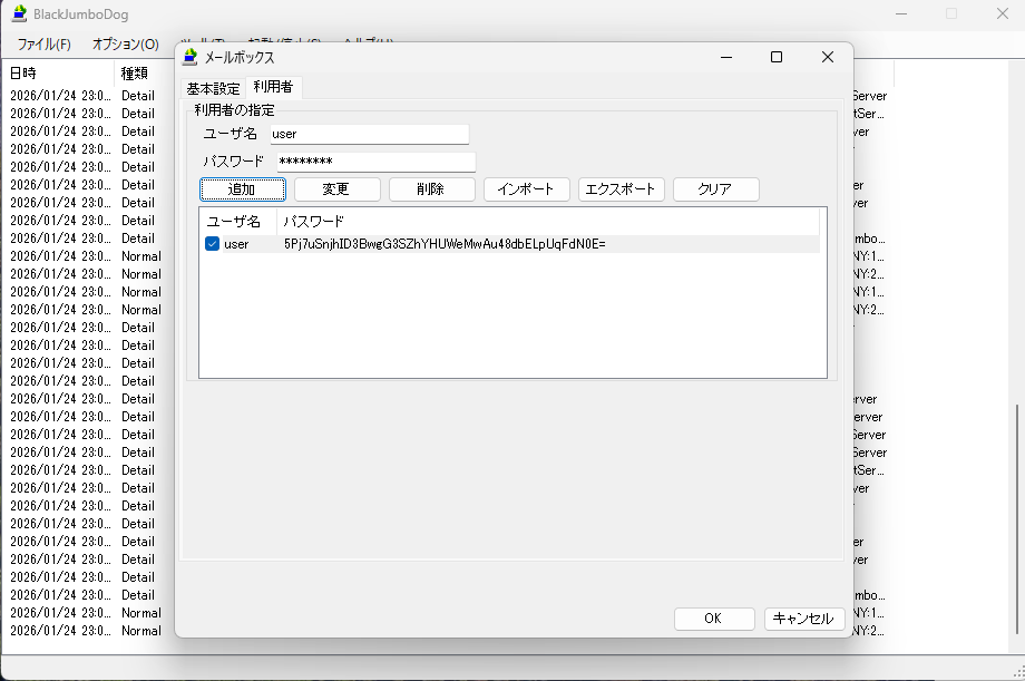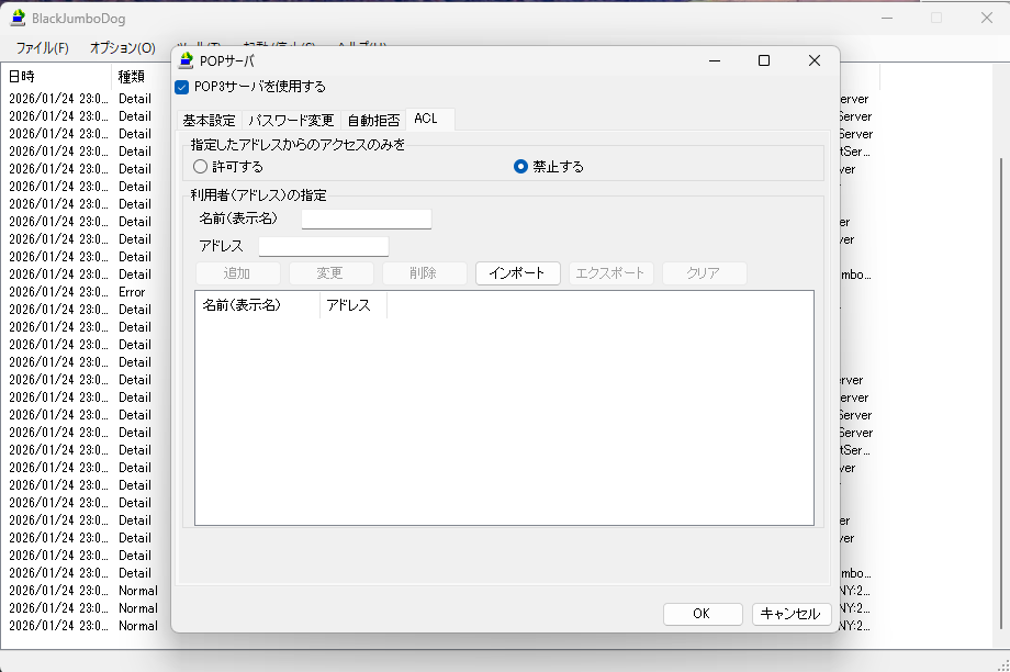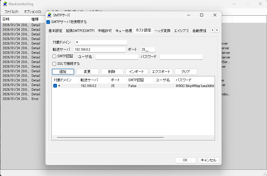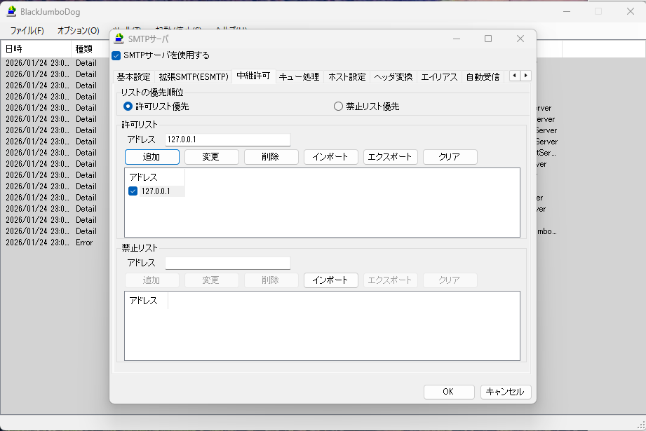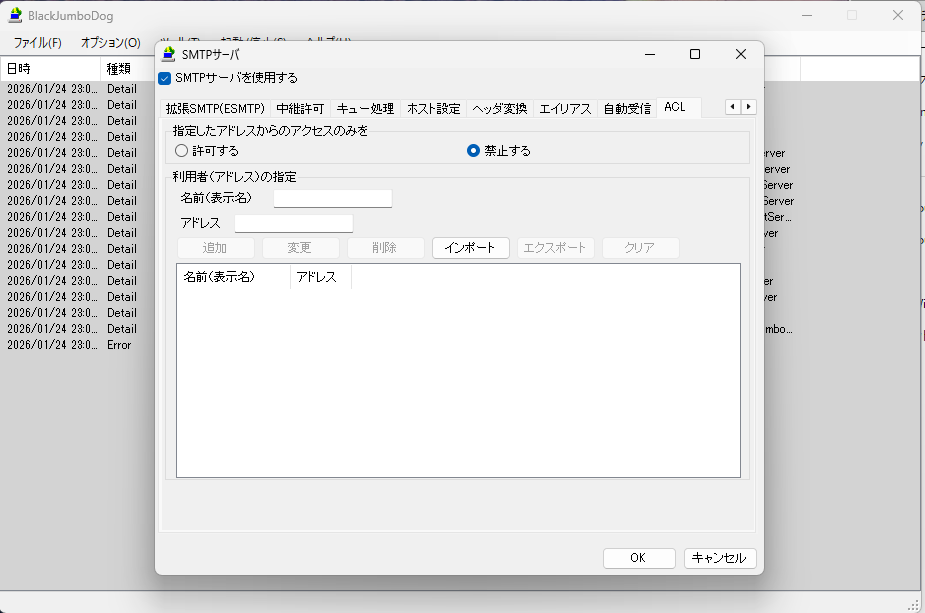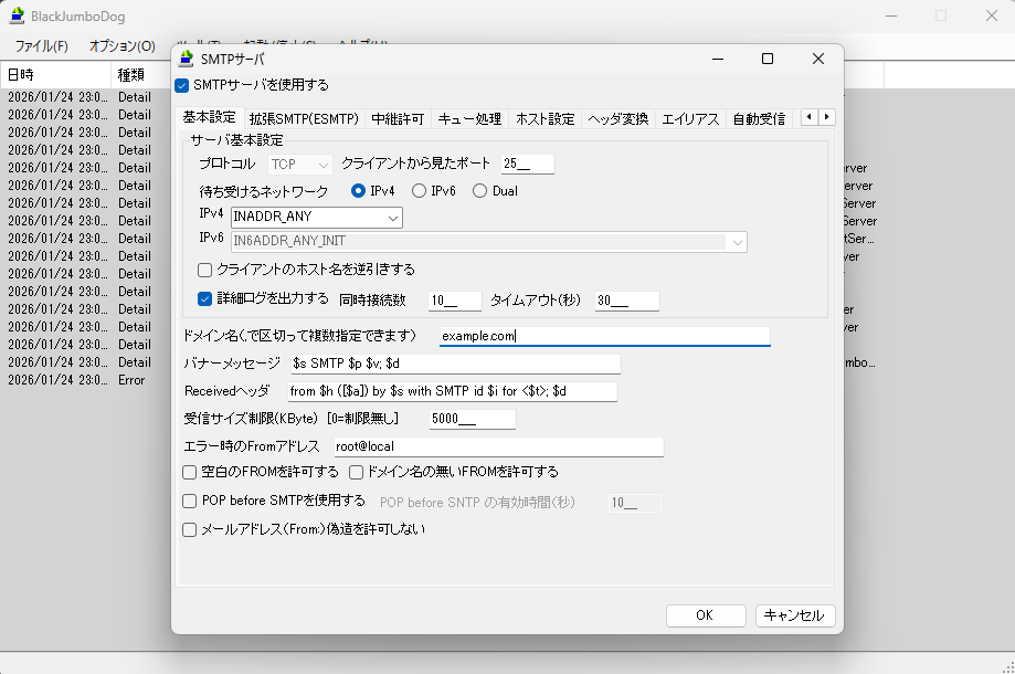メールが届かない場合は、BlackJumboDogのログ画面でエラーメッセージを確認してください。Windows Defender FirewallやACL、中継許可の設定が原因であることが多いです。