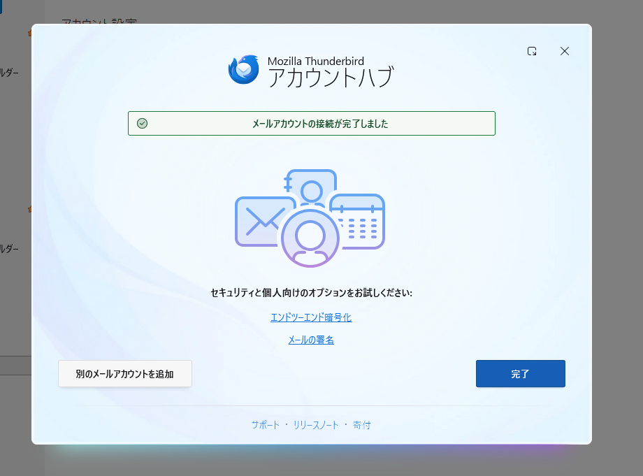 「メールアカウントの接続が完了しました」と表示されれば設定完了です。