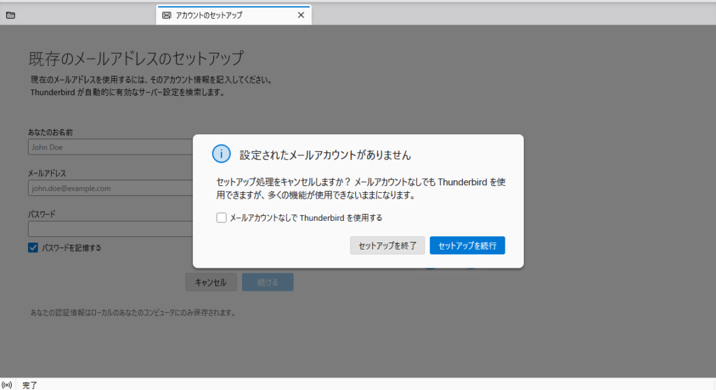 Thunderbirdを起動します。初回起動時は「既存のメールアドレスのセットアップ」画面が表示されます。