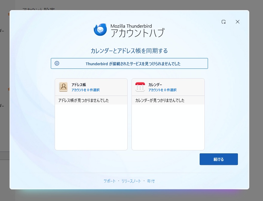 ローカルメールサーバーではこれらのサービスは利用できないため、「続ける」をクリックしてスキップします。