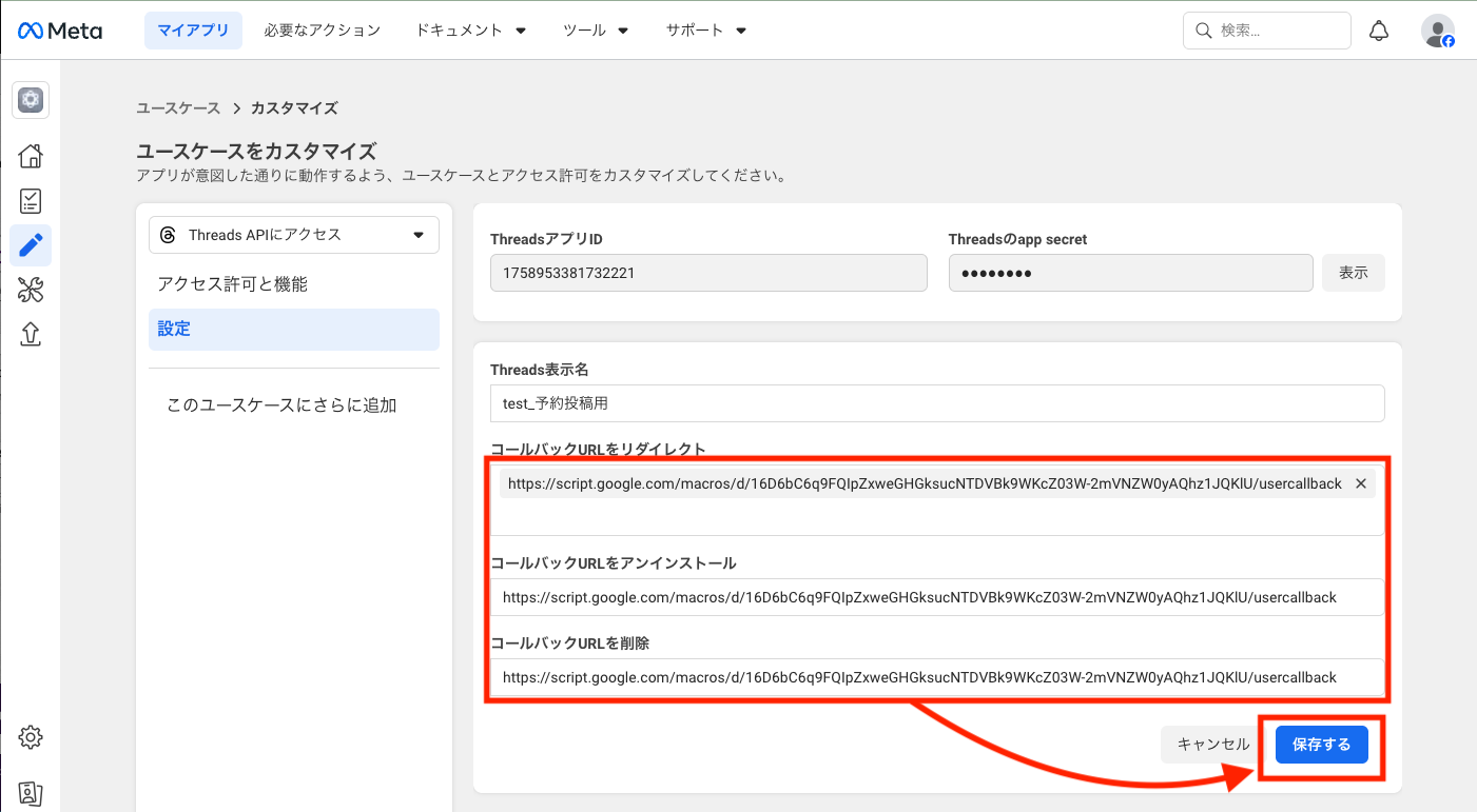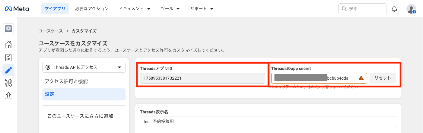 左メニュー[Threads APIにアクセス]>[設定]をクリックします。