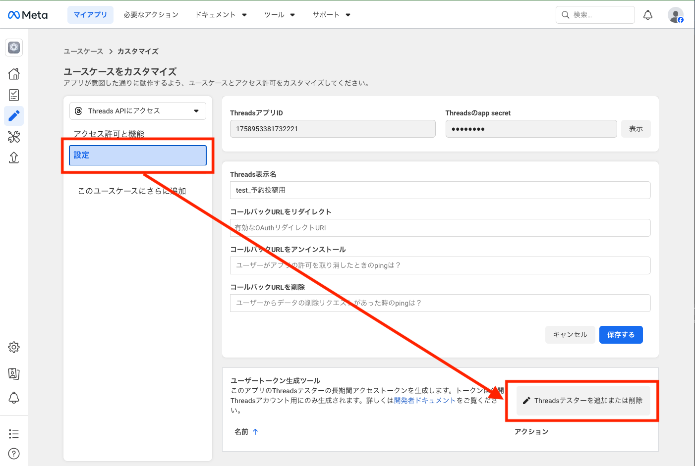 ページ下部の[ユーザートークン生成ツール]>[Threadsテスターを追加または削除]をクリックします。