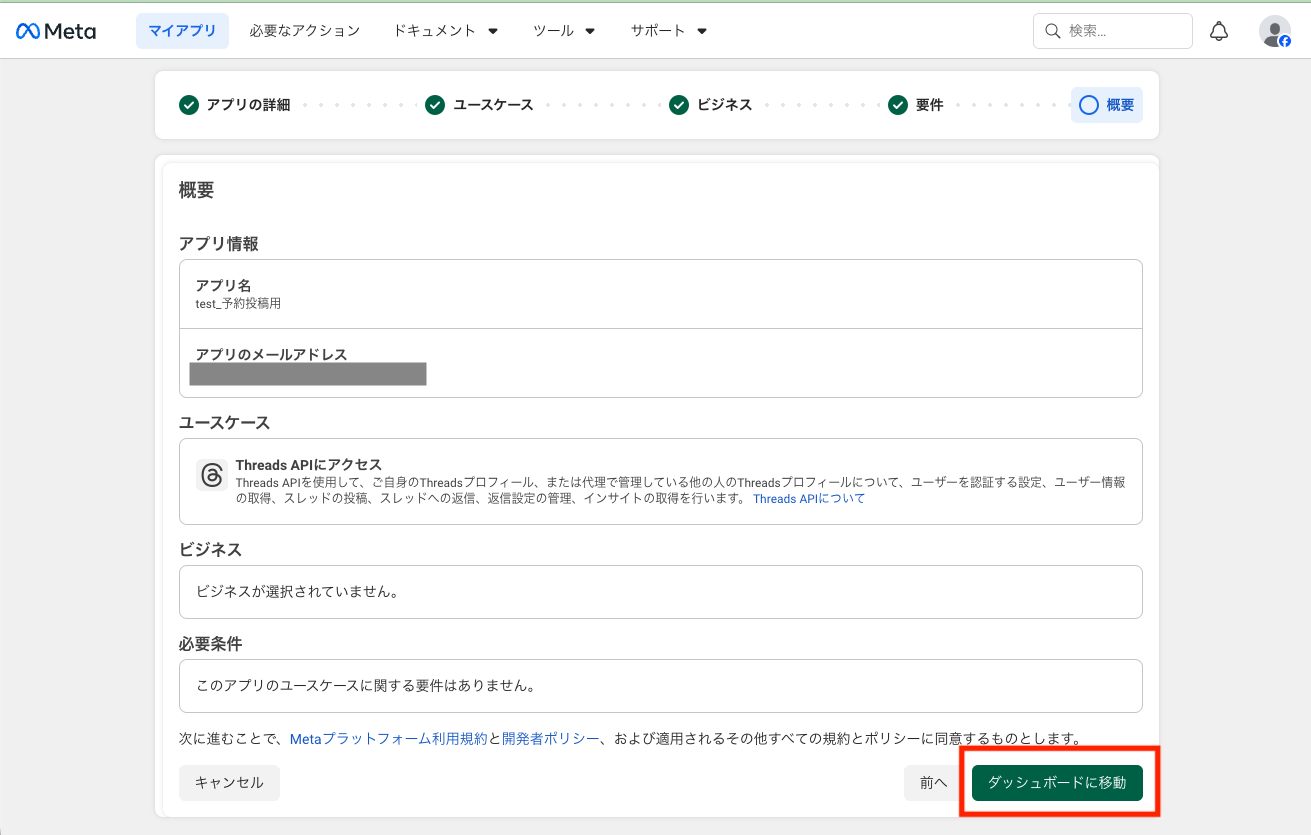 作成後、Meta開発者ポータルよりデベロッパーダッシュボードへ移動し、[アプリを作成]をクリックします。