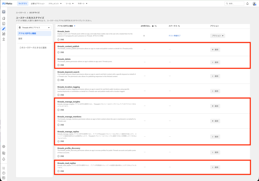 左メニュー[Threads APIにアクセス]>[アクセス許可]より、下記のアクセス許可を[追加]します。