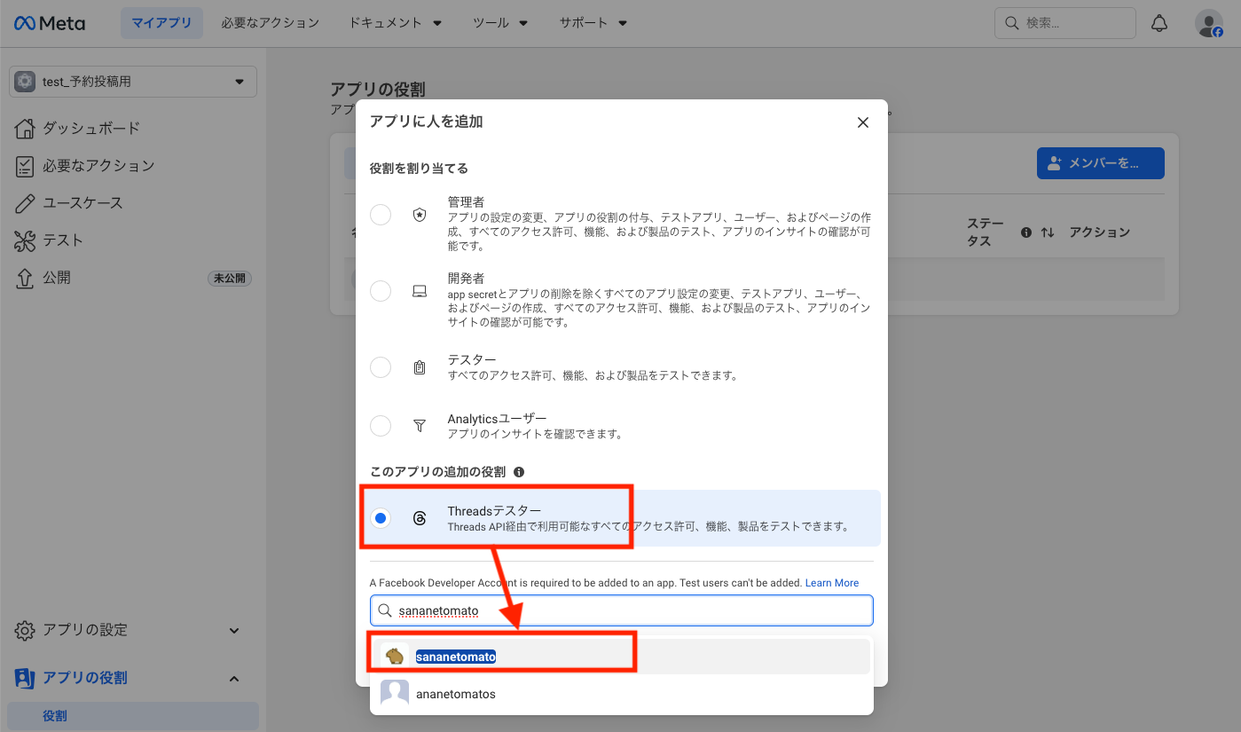 [Threadsテスター]にチェックを入れ、検索欄に今回利用したいアカウントのユーザネームを入力し[追加]をクリックしてください。