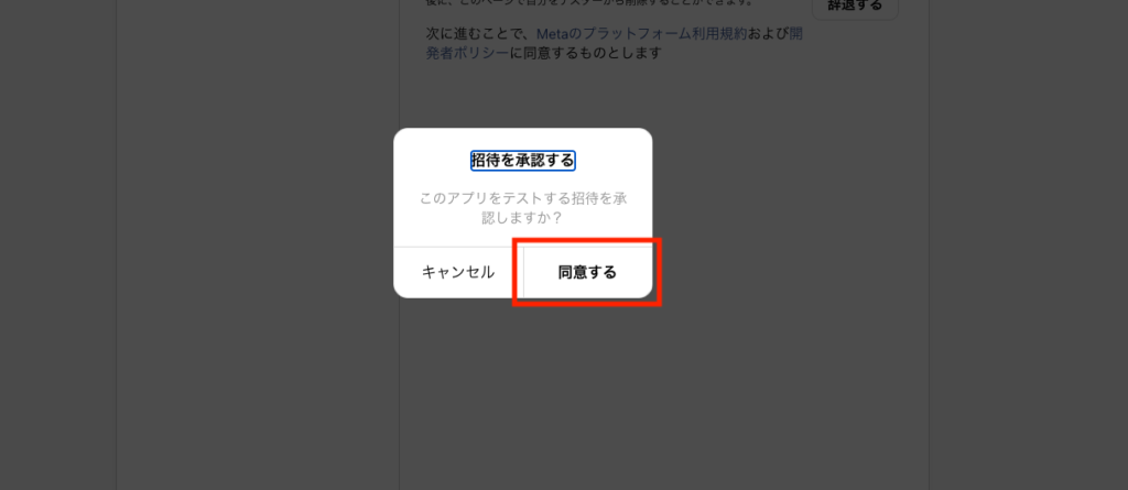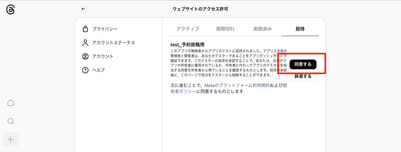 [招待]より、追加したアプリの[同意する]をクリックします。