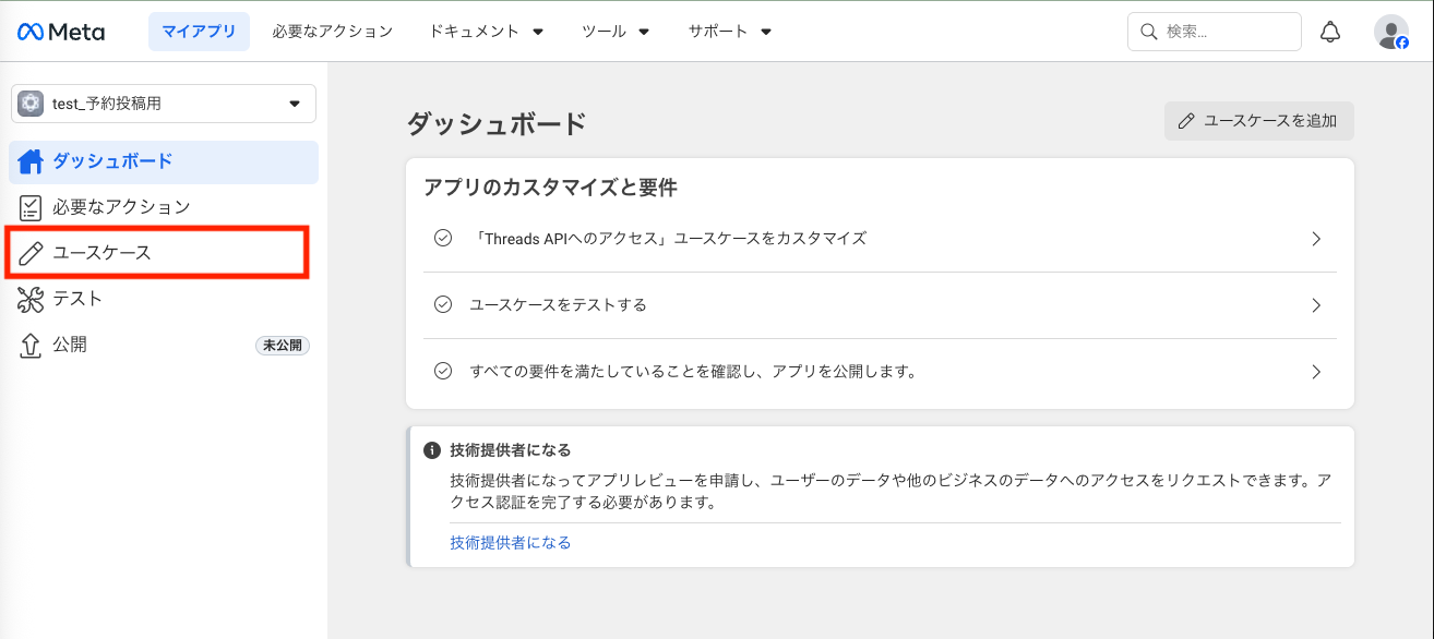 右上[マイアプリ]>作成したアプリ>左メニュー[ユースケース]をクリックします。