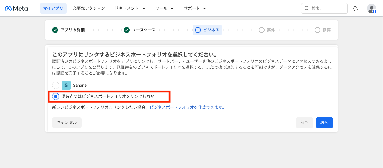 [現時点ではビジネスポートフォリオをリンクしない。]にチェックを入れ、[次へ]をクリックします。