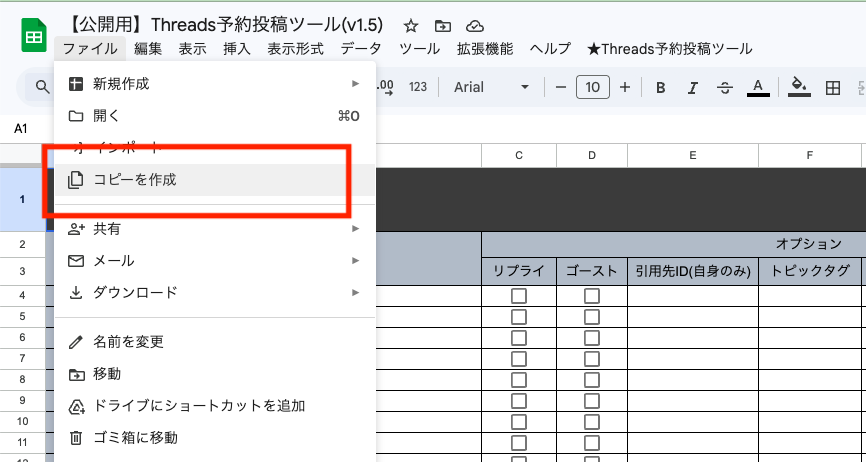 本ツール(スプレッドシート)の上部メニュー[ファイル]>[コピーを作成]をクリックします。