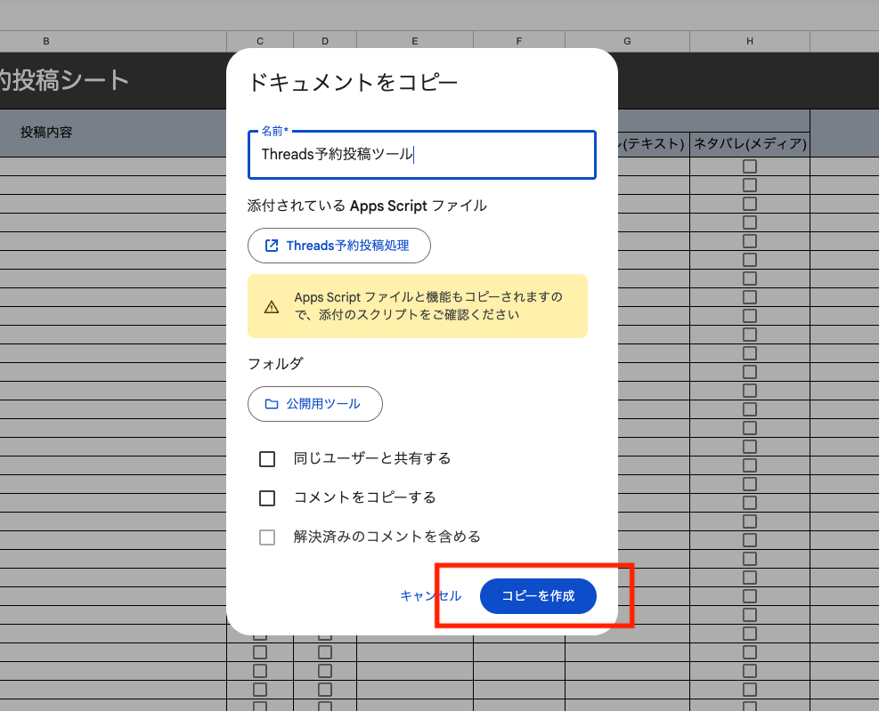 アクセス先のスプレッドシートは閲覧権限となっているため、まず初めにスプレッドシートを自身のアカウントにコピーする必要があります。
