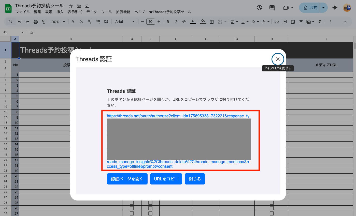 スプレッドシートの上部メニュー[★Threads予約投稿ツール]>[事前準備メニュー]>[③アカウント認証]をクリックします。