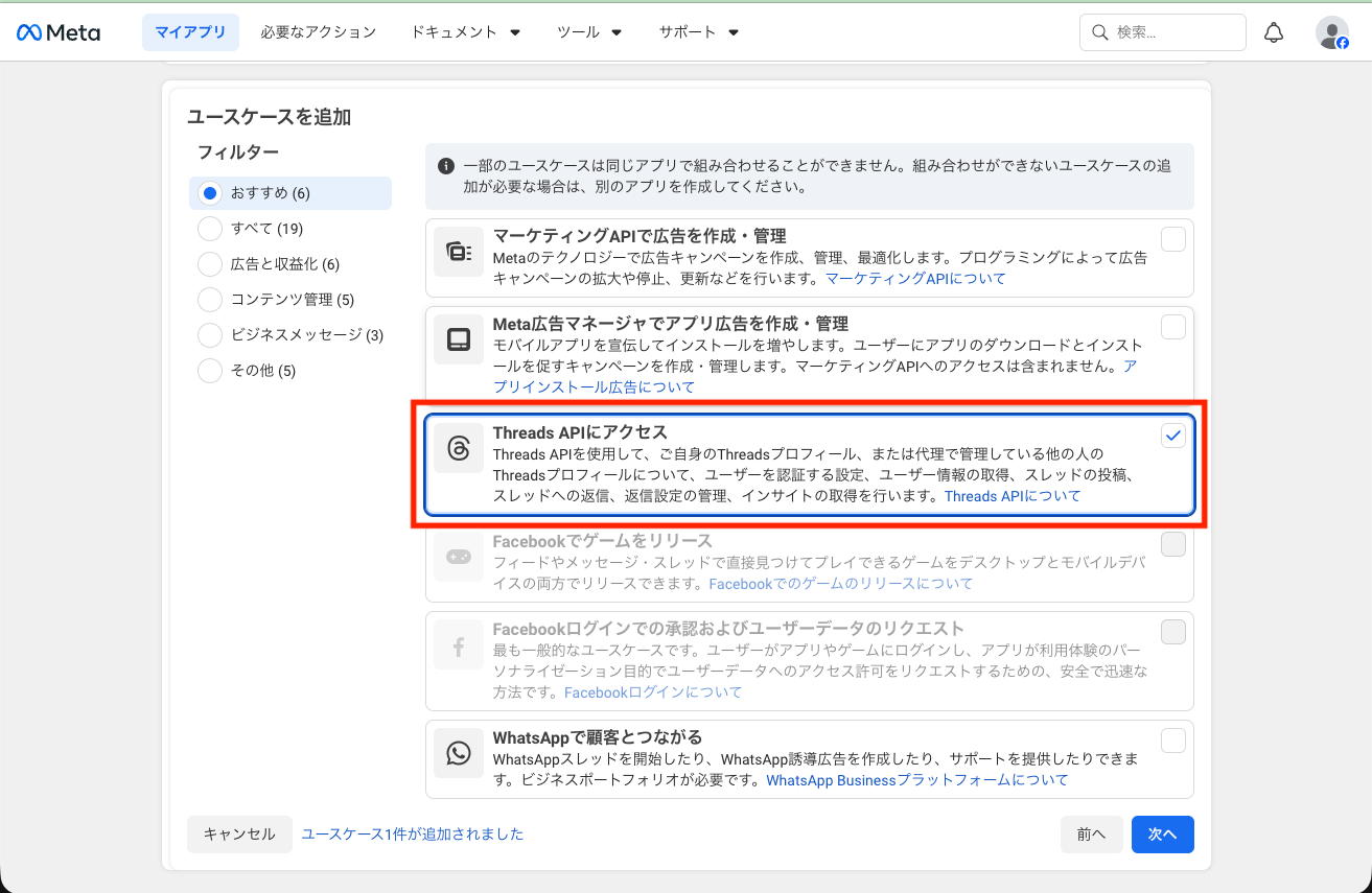 [ユースケース]では、[Threads APIにアクセス]を選択し、[次へ]をクリックします。