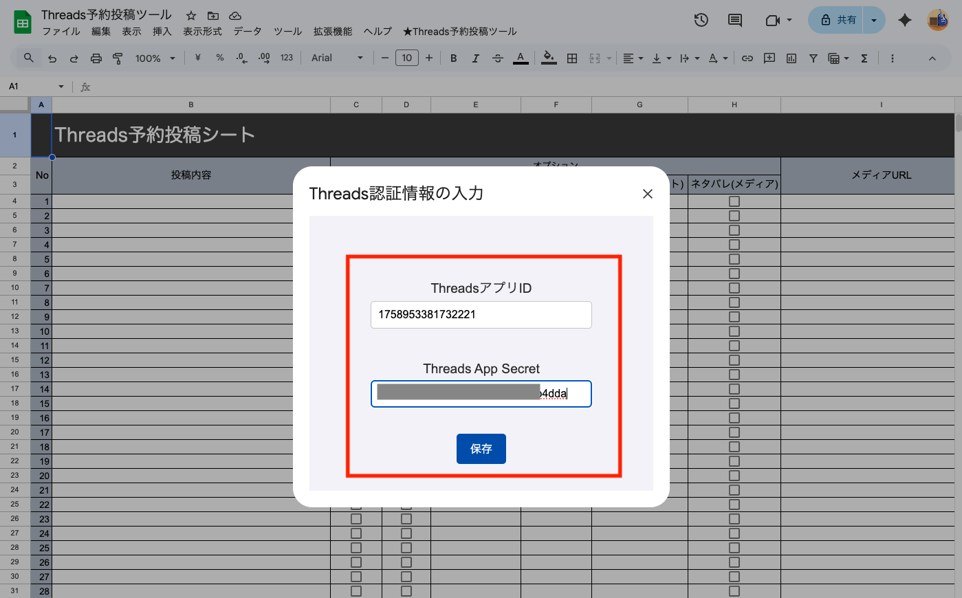 スプレッドシートの上部メニュー[★Threads予約投稿ツール]>[事前準備メニュー]>[②認証情報入力]をクリックします。