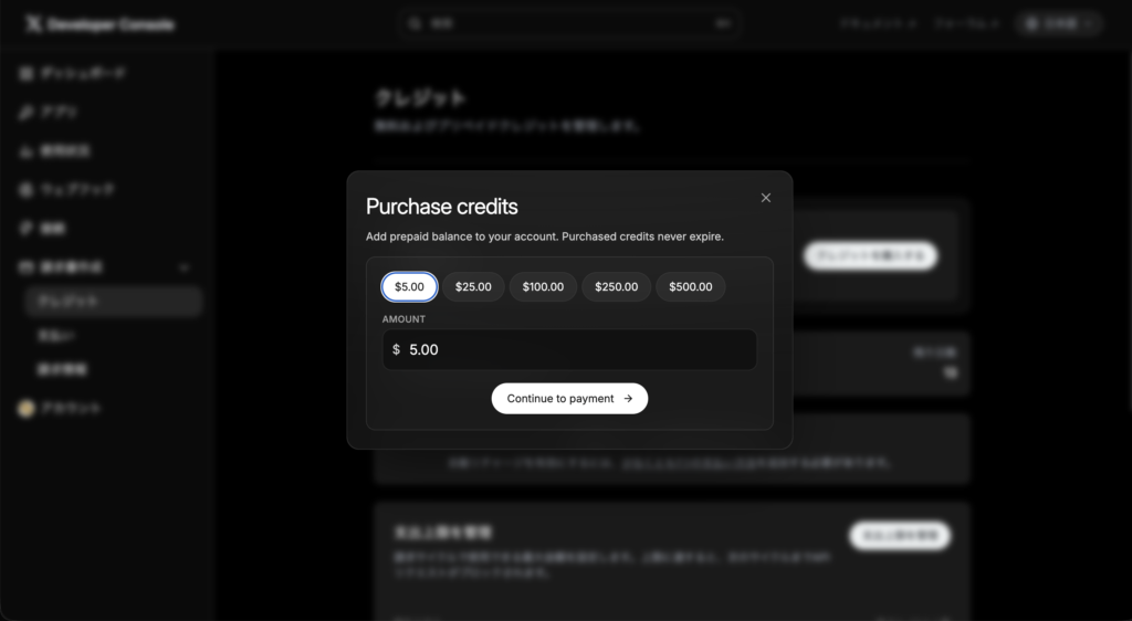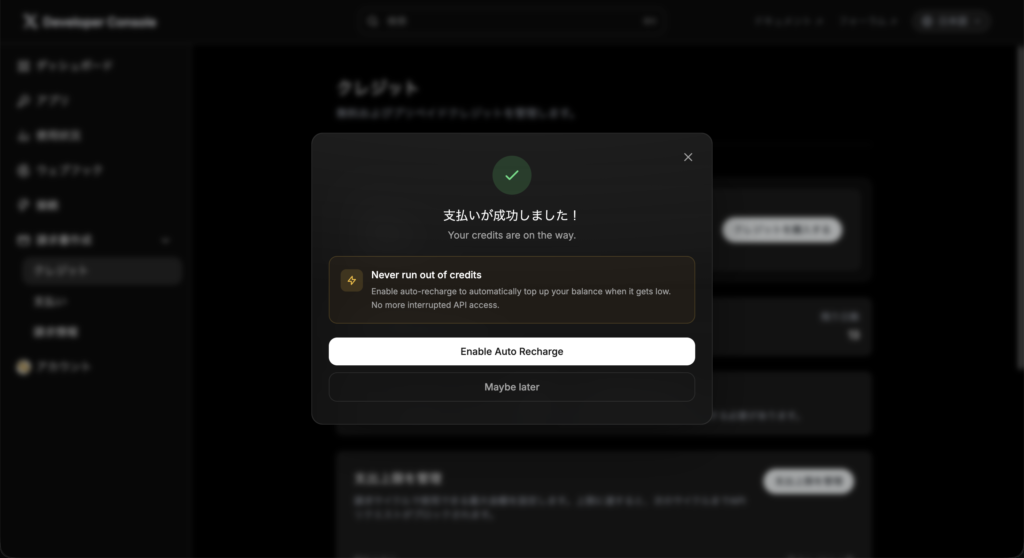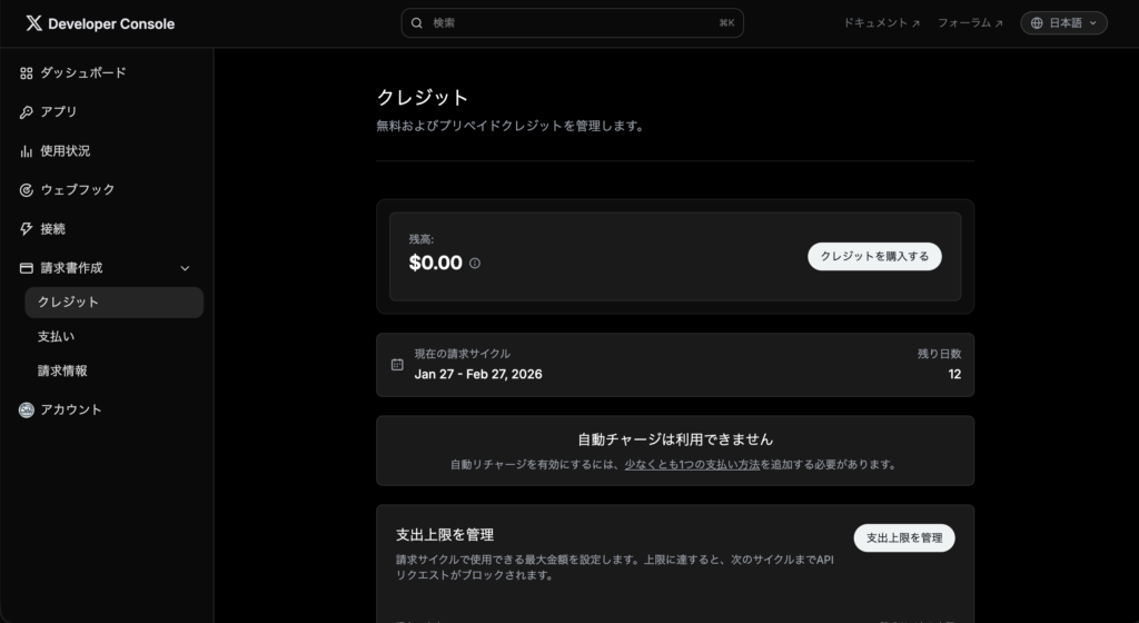 クレジットの購入が完了すると、クレジットページにクレジット残高が反映されます。これでX APIの利用が開始できます。