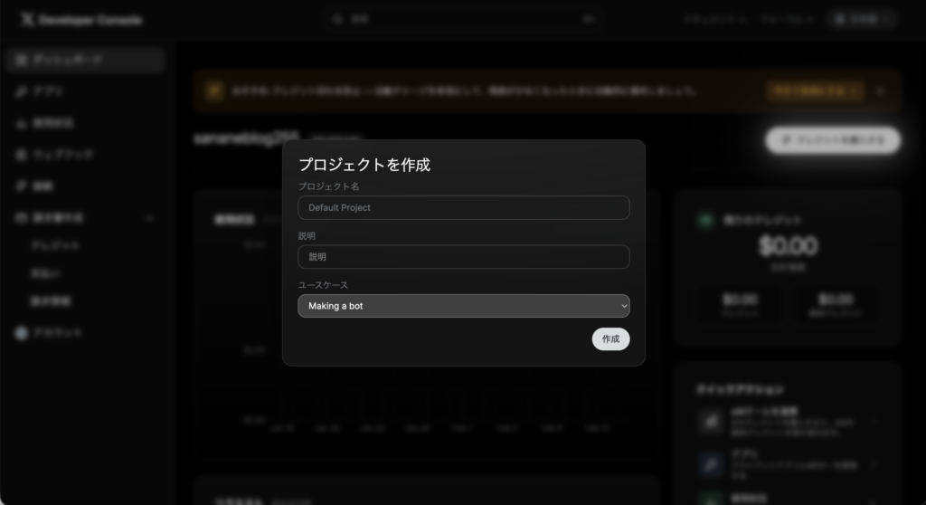 https://console.x.com/ にアクセスし、APIを利用したいXアカウントでログインします。自動的にダッシュボードに移動します。