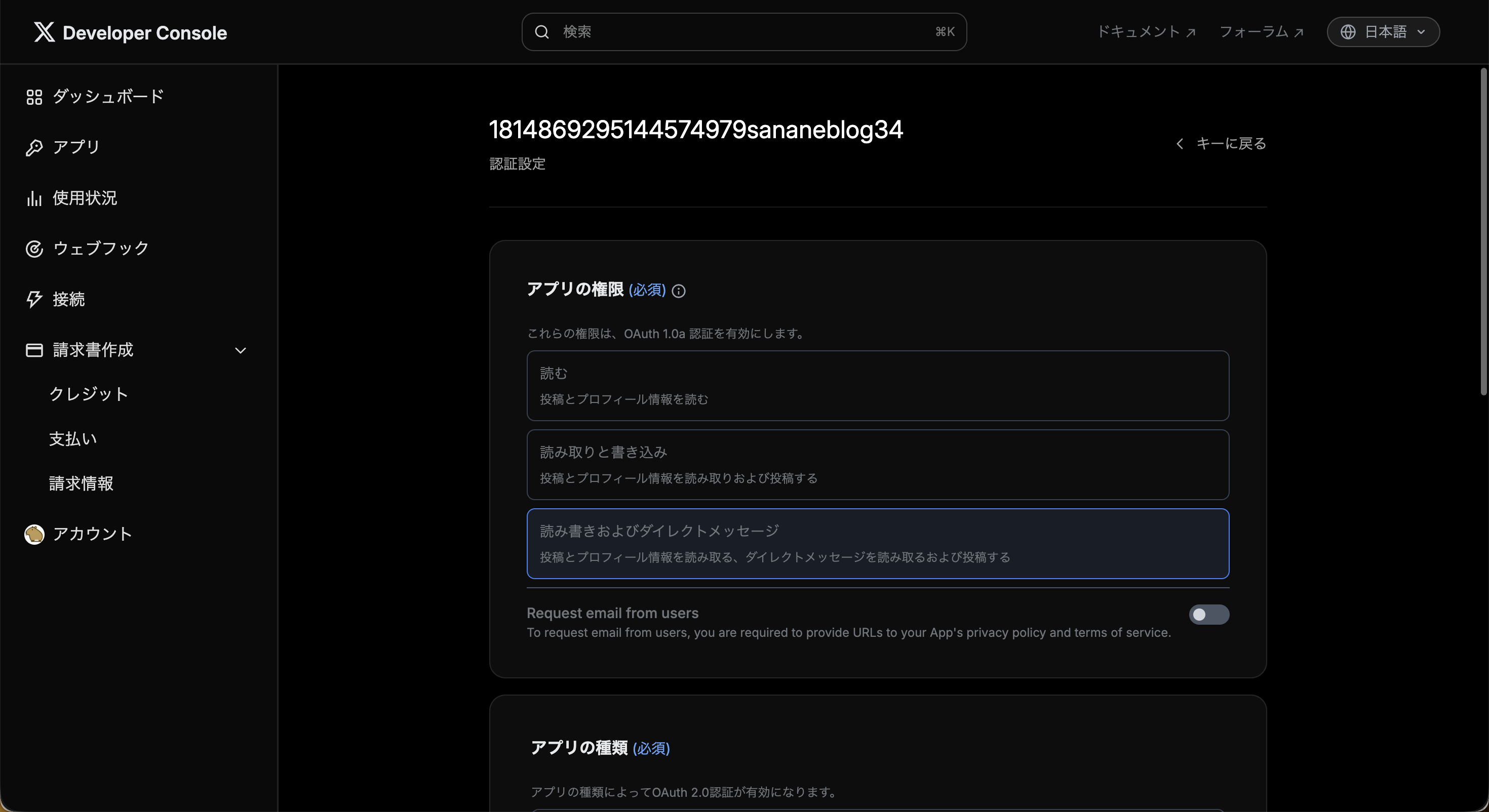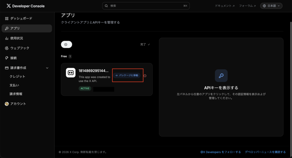 クレジットの購入が完了したら、次はアプリのAPIキー確認と認証設定を行います。X Developer Consoleでは、旧X Developer Portalと同様にOAuth 2.0キーの確認および認証設定が引き続き可能です。